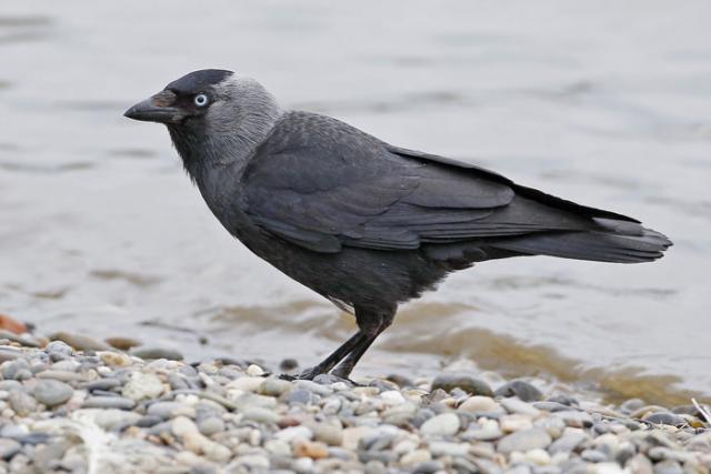 Bien plus petit que la Corneille noire, il a la taille d'un pigeon. Plumage noir ardoisé, nuque et côtés du cou gris clair ardoisé, l'iris blanc contraste avec le masque noir.